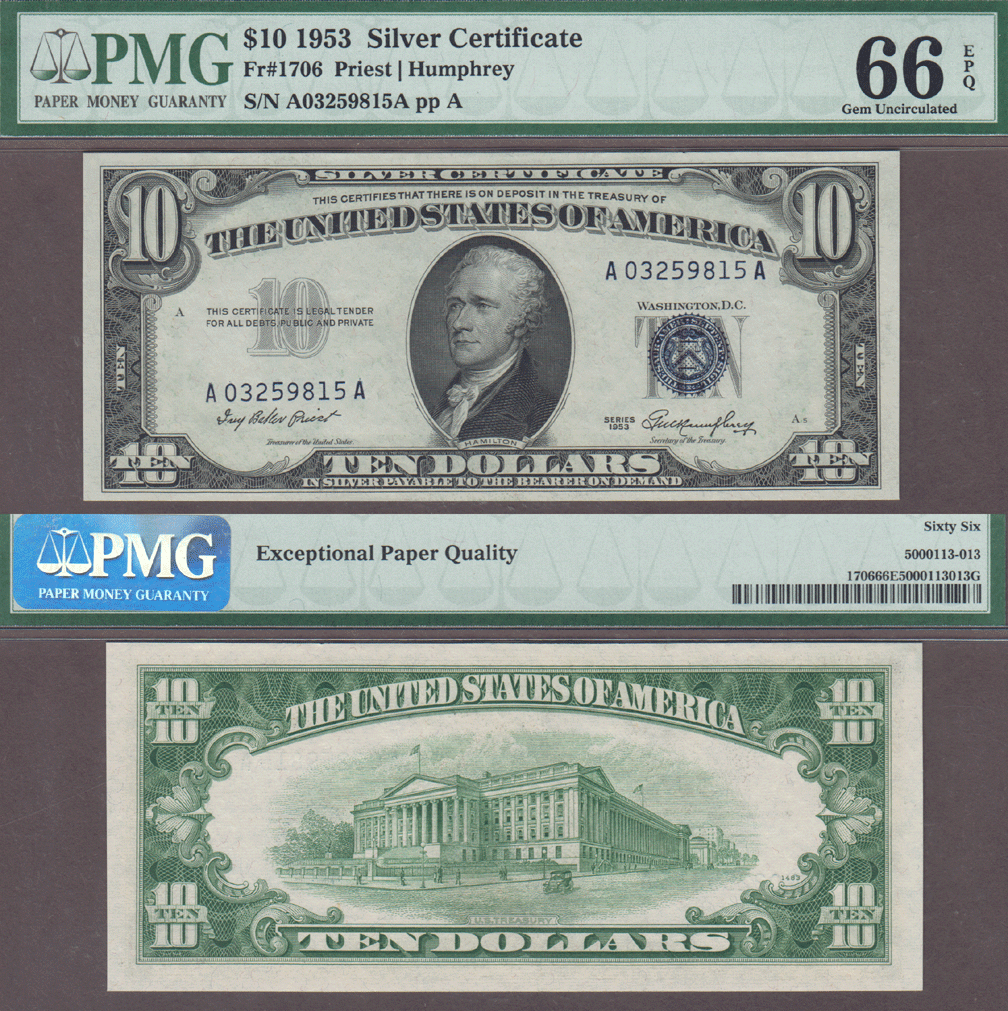 Item Number: SSC-273 PMG Choice Uncirculated 66 EPQ - Priest/Humphrey FR-1706 - Exceptional $10 silver certificate that would be hard to improve. "EPQ" Exceptional Paper Quality. As of 7-21 PMG has only graded 5 notes better.$375.00