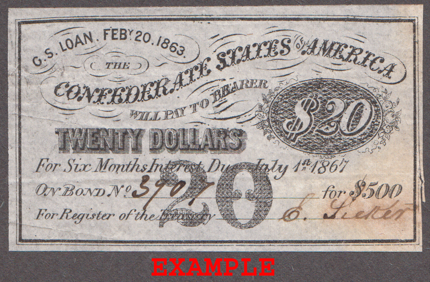 Fine or Better - You will receive a $20 Confederate bond interest coupon from a 1863 $500 Confederate Bond. Printed area approximately 1-1/2" X 3"