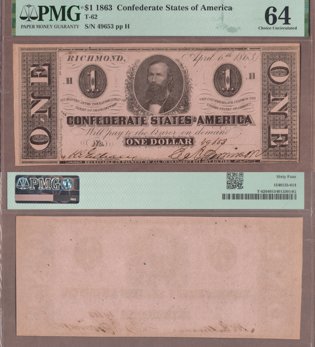 PMG Choice Uncirculated 64 - T-62 April 6th 1863 - High grade for this Type. PMG has only graded 16 better. Uniface note with Clement C. Clay at center.