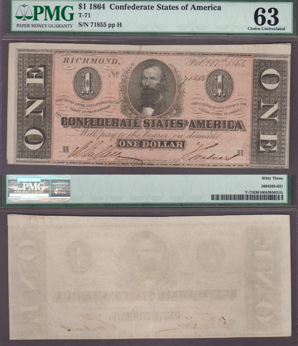 Item Number: CSA-226 PMG Choice Uncirculated 63 - Feb. 17th 1864 - Choice Uncirculated example with clean paper and part of another note on upper edge. Portrait of Clement Clay a Alabama Senator for the Confederate States. Serial # 71855$195.00