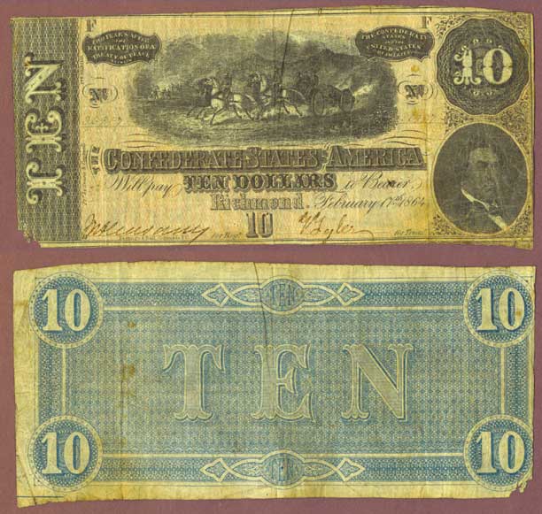Item Number: CSA-63 Fine+ Feb. 17 1864 Serial # 56957 - F - Horses pulling cannon - Bust of R.M.T. Hunter Confederate cabinet member at lower right. Small corner missing at lower left.$30.00