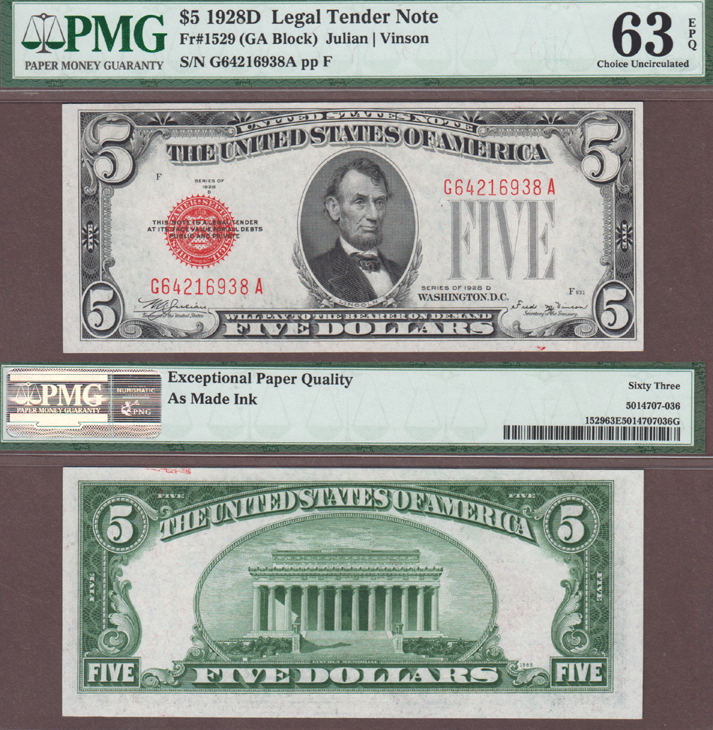 Item Number: SLTN-215 PMG Choice Uncirculated 63 EPQ - FR-1529 Julian/Vinson - GA Block - White crisp fresh paper with great color contrast. Well centered with a speck of as made red printers ink on margin. "Exceptional Paper Quality" $180.00