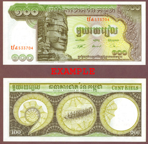 Crisp Uncirculated - #8c Large Size note with Brown/Green front Statue of Lokecvara at left. Back is green/brown with men rowing long boat. Watermarked with Buddha
