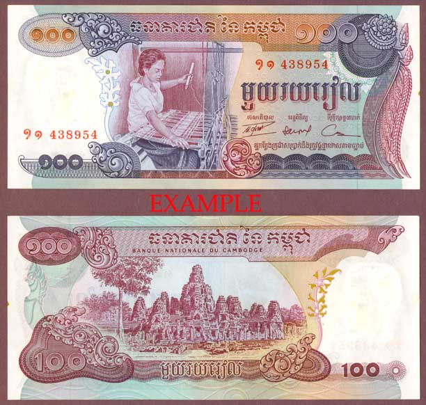Item Number: CAM-26E Uncirculated - #15A Large Size note with Purple and violet on multicolored underprint. Woman weaving carpet on front. Angkor Wat on back.$3.00