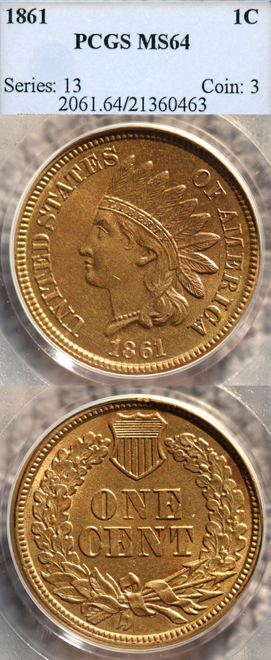 1861 1c US Indian cent copper nickel PCGS MS 64