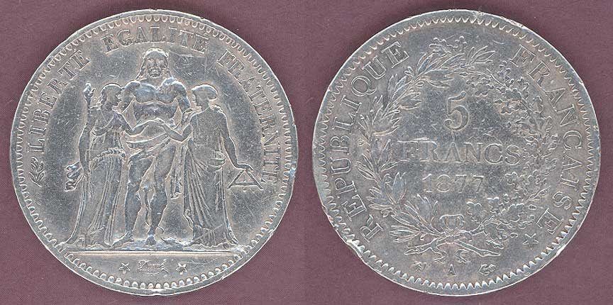 Item Number: F-47 Fine+ 5 Francs #820.1 .900 Silver Paris Mint - Hercules at center. Cleaned at one time. Large silver dollar size coin about 37 MM.$65.00