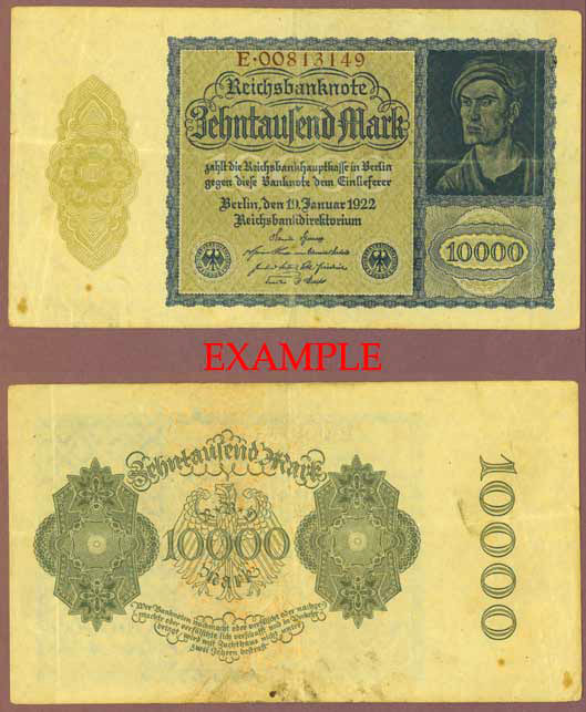 Item Number: GER-74E Very Fine or better #72 Large size note 7-1/8" X 3-7/8" Front is blue green on olive-brown underprint. Male portrait at right by Albrecht Durer. Back is light green with ornate eagle on watermarked paper.$5.00