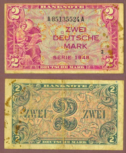 Item Number: GER-72 Very Fine #4-A Front is Lilac on blue-green underprint. Allegorical woman seated at left holding tablet. Back is green on reddish-pink underprint. Light stain on right side of note.$45.00