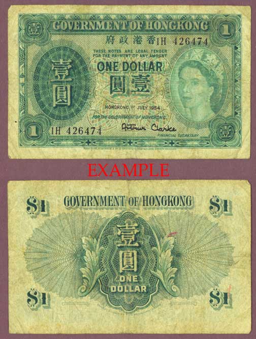 Item Number: HK-35E Very Good or Better - #324A The Government Of Hong Kong Front is dark green with multicolored underprint and Queen Elizabeth at right. Back is green.$5.00