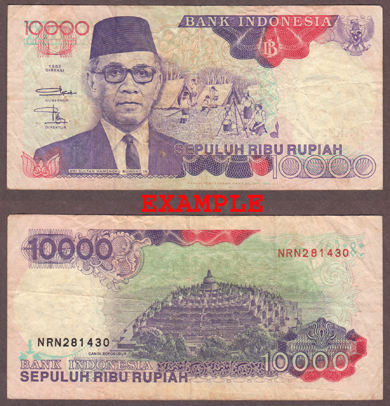 Item Number: INDO-51E Very Good or Better - #131 Purple and red on multicolored underprint with Sri Sultan Hamengku Buwono IX at left. Girl scouts at center right. Back:Borobudur Temple on hillside. Watermark: W. R. Soepratman$5.00