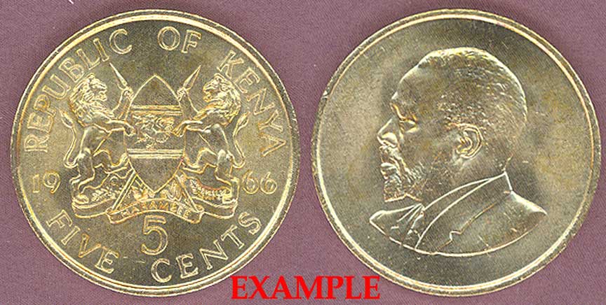 Item Number: KEN-23E Uncirculated - 5 Cents KM-1 Nickel-Brass - Bust of Mzee Jomo Kenyatta (First President of Kenya) on Reverse. Arms with lions dividing date on Obverse. Approximately 25.5 MM$4.00