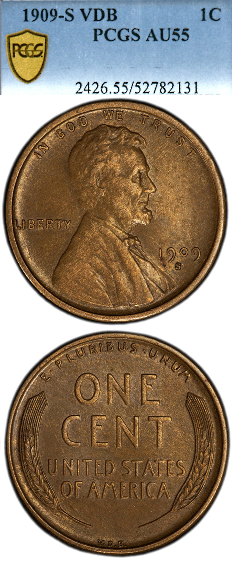 PCGS About Uncirculated 55 - THE KEY DATE to the series. Sharply detailed High Grade AU with original no problem brown surfaces. Very scarce coin that most collectors are missing. The lowest minted non Proof Lincoln cent made since 1909. Mintage of only 484,000