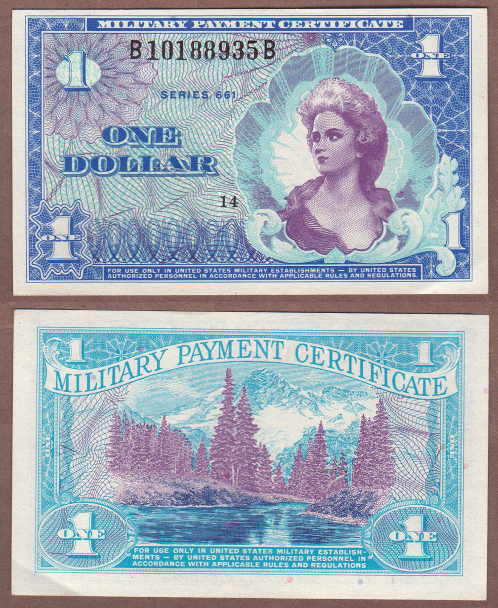 Choice About Uncirculated - Issued 10-21-68 to 8-11-69 - Beautiful fresh crisp note with slight corner fold from uncirculated.. Front is multicolored with blues and green with female profile. Back is image of Mount Rainier with light blue and darker red/brown ink.