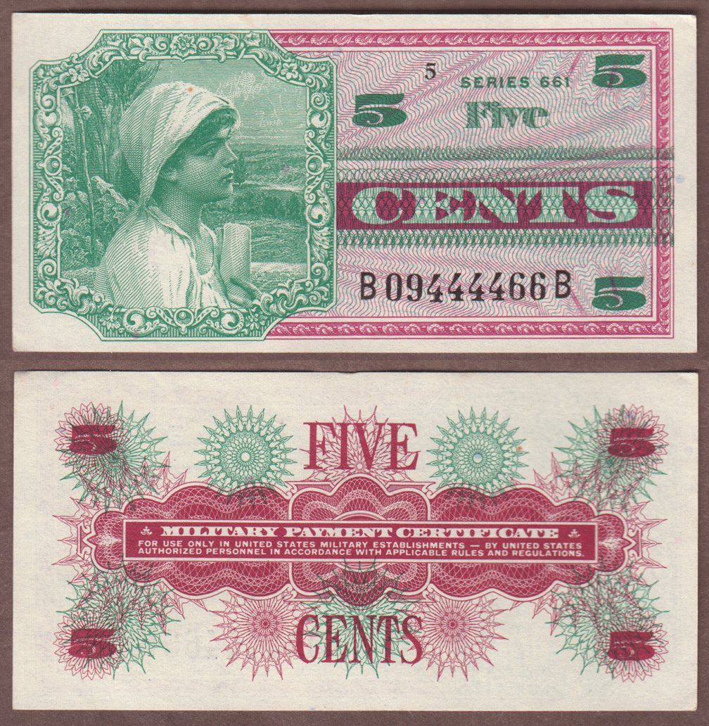 Item Number: MPC-249 Choice Almost Uncirculated - Issued 10-21-68 to 8-11-69 Clean bright paper with the lightest touch of handling. Front is Green and Pinkish/Red with female profile. Back is Green and Pinkish/Red.$10.00