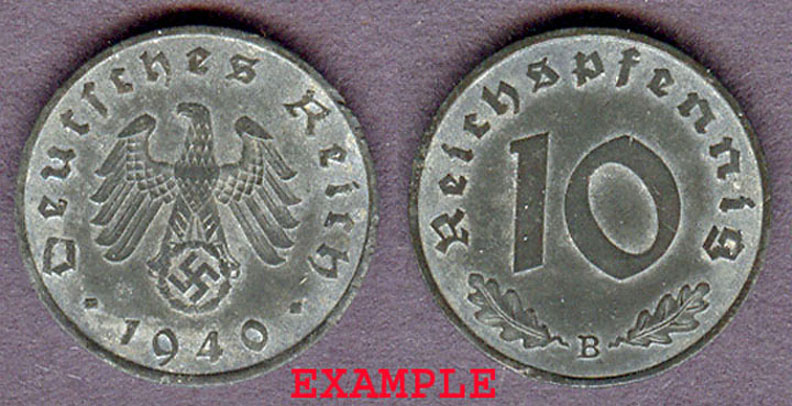 Item Number: Ger-57E Fine or Better - #101 - 10 Reichspenning Zinc Various Mints with Eagle on Swastika. About the size of a US nickel.$5.00
