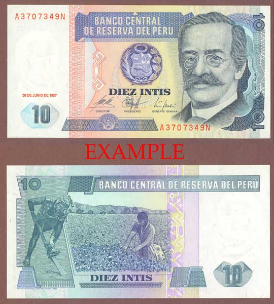 Item Number: P-24E Choice Uncirculated - 10 Intis #129 Front is Black, dark blue and purple on multi-colored underprint with portrait of Ricardo Palma at right. Indian farmers digging and picking cotton.$2.00