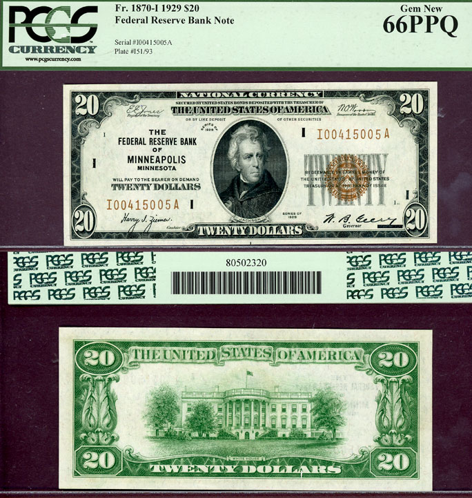 Item Number: SFRBN-86 PCGS GEM New 66 PPQ - FR-1870-I - PCGS has only graded 4 better. Beautiful bright clean GEM+ note with "Premium Paper Quality" from the Minneapolis district. Only 864,000 notes made. $695.00