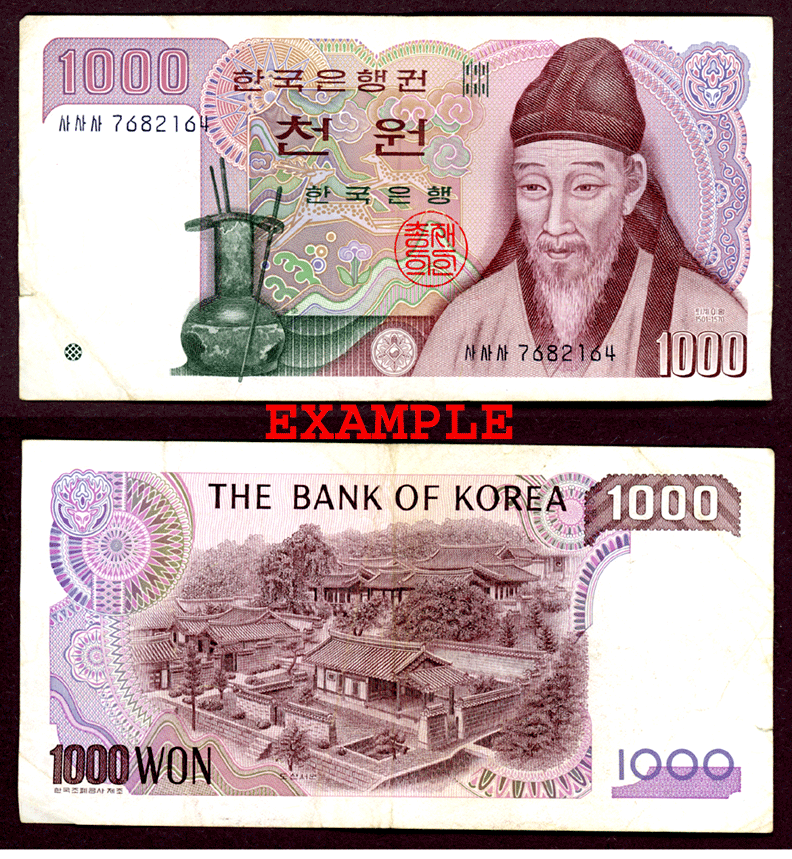 Item Number: KOR-50E Very Good or Better - #47 - Front is Purple on multicolored underprint with portrait of Yi Hwang at right. Back has buildings of Tosansowan Academy. Watermark: Yi Hwang$4.00