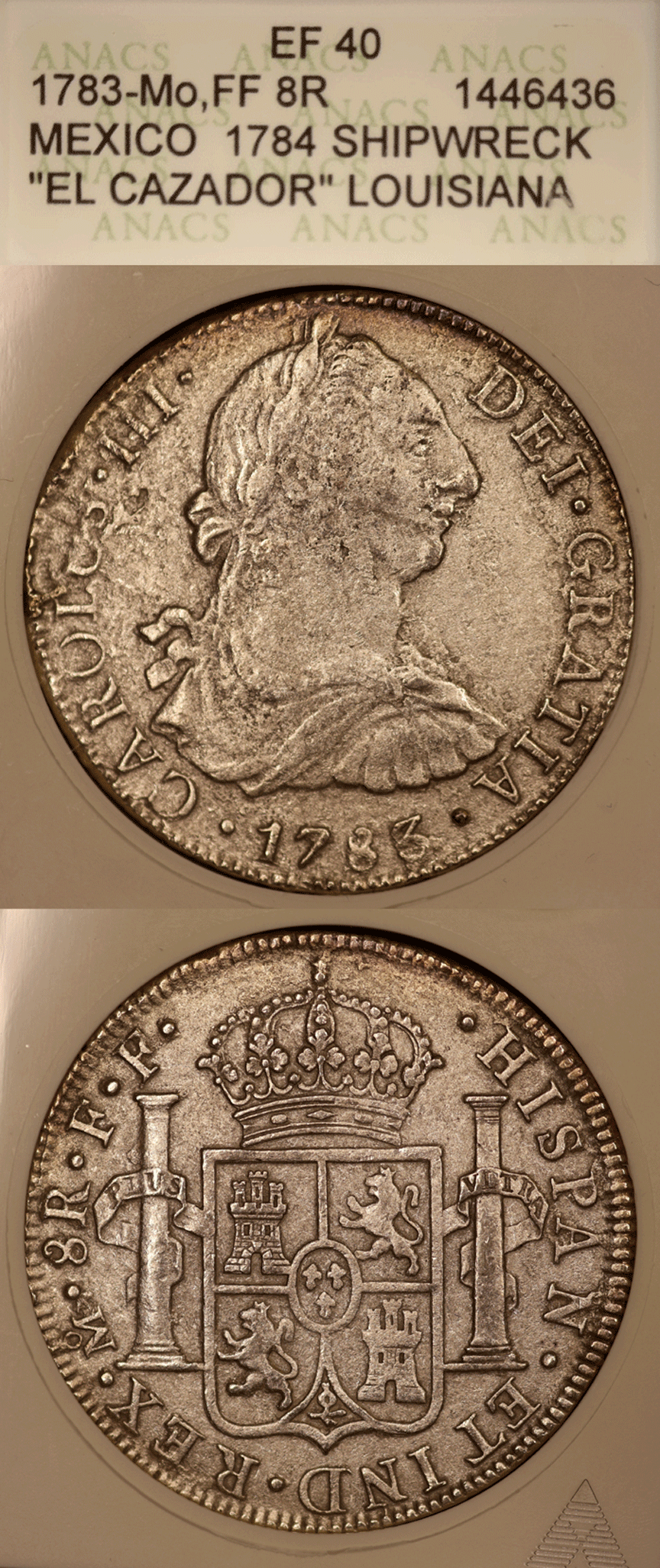 ElCaz-37 ANACS Extremely Fine 40 - 1783-MO,FF 8 Reales - From the Shipwreck "El Cazador" Louisiana - This is the highest grade coin that I have seen from this wreck. The ship El Cazador (meaning The Hunter in English) was a Spanish Brig. On October 20, 1783 it was sent by Charles III of Spain on a mission to bring hard currency to the Spanish colony of Louisiana. The ship sailed to Vera Cruz, Mexico, where it was loaded with silver coins. On January 11, 1784, it sailed for New Orleans, and was never heard from again. Then, on August 2, 1993, the trawler Mistake, while fishing in the Gulf of Mexico fifty miles south of New Orleans, hung its net on something in 300' of water. When the crew hoisted the net up and dumped the contents on the deck, they found the net was filled with silver coins. The coins bore markings from the Spanish mint in Mexico, along with the date 1783.