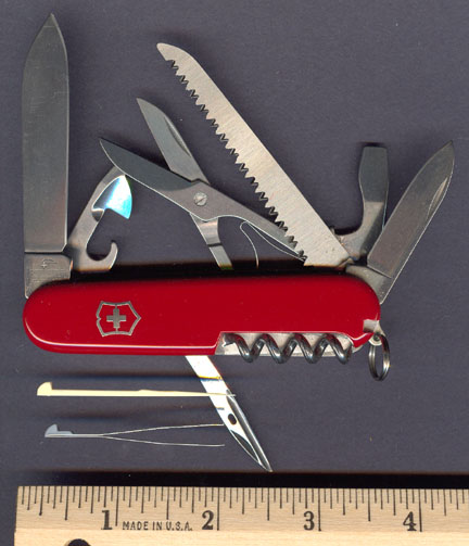 The Original Swiss Army Knife made by Victorinox was introduced over 100 years ago 1891. It has helped explorers reach the North Pole, Mt. Everest and now is on every mission NASA sends to space. Don’t be fooled by cheap imitators. This knife is the Huntsman #73500 and is 3 1/2" closed with red handles and is New in the Box. Features large blade, small blade, wood saw, scissors, can opener with screwdriver tip, bottle opener with screwdriver tip, wire strippers, reamer with sewing eye, corkscrew, toothpick, tweezers and key ring.
